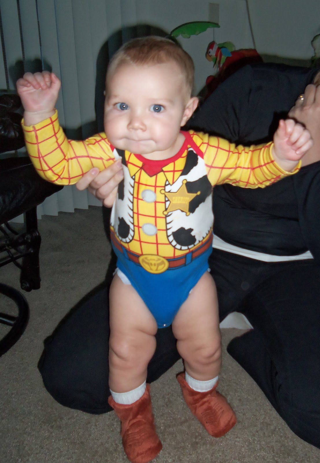 This Halloween we really didn't do anything, no decorations, we didn't carve a pumpkin and the little pumpkin we got for Owen got shoved around on top of the refrigerator where it still sits. We didn't even get trick or treaters! But we did go to a party, so we all got dressed up and ate delicious food with fun friends and I watched some of Monsters Inc. with the kids and I forgot how hilarious that movie is! It is a good one! Owen was Woody, but his hat was too small and he squeezes his toes together whenever we try to put shoes on him so his cute boots wouldn't stay on either, so he had only his little onesie. The good thing is the weather was great, we didn't even need jackets. Matt and I were still football players, easy. Here are some funny pictures mainly of Owen, especially this first one!